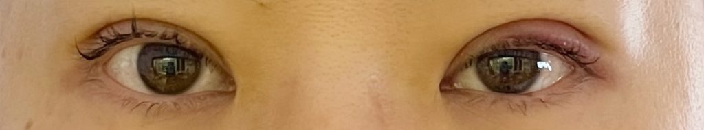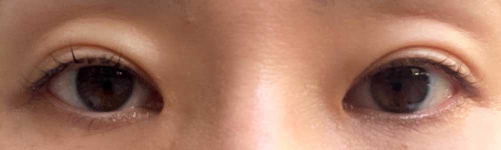 手術前は、軽度の眼瞼下垂があり、夕方にガッツリ窪み目になるタイプです。まぶたの重さで眠そうな印象になりがち。術後1ヶ月でまだ食い込みが強いですが、まつ毛の生え際がしっかり見え、まぶたがすっきり見えるようになりました。正面からの視線がパッチリして、顔全体の印象が明るくなった気がします。※二重幅は変更していません。