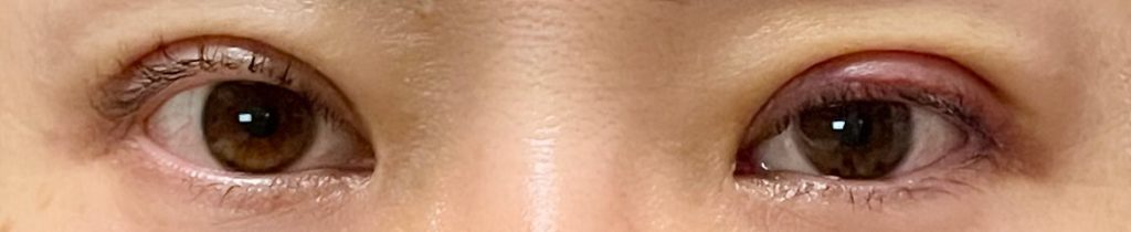 大量の目やにがでる。内出血が目立ち始め、片側は赤紫っぽい色味が出てきました。腫れもピークに。本当にこの腫れが治まるのか不安のピークでもありました。