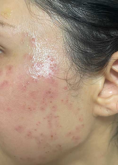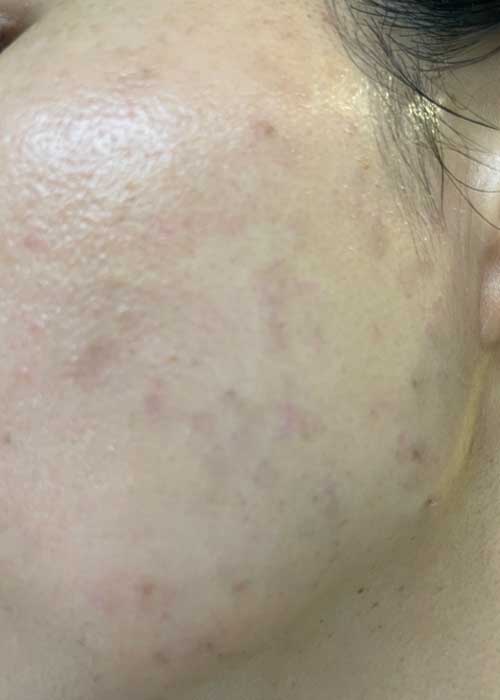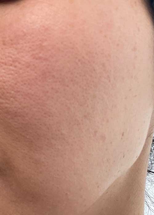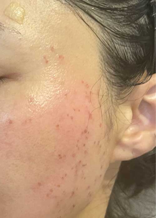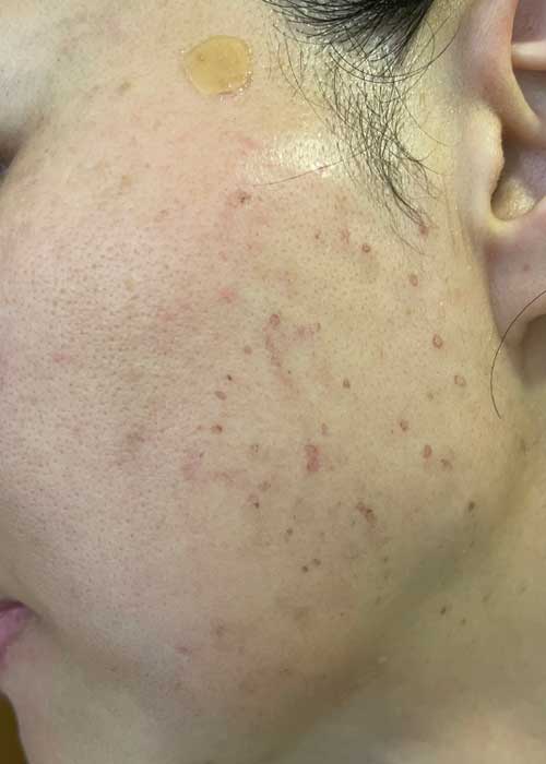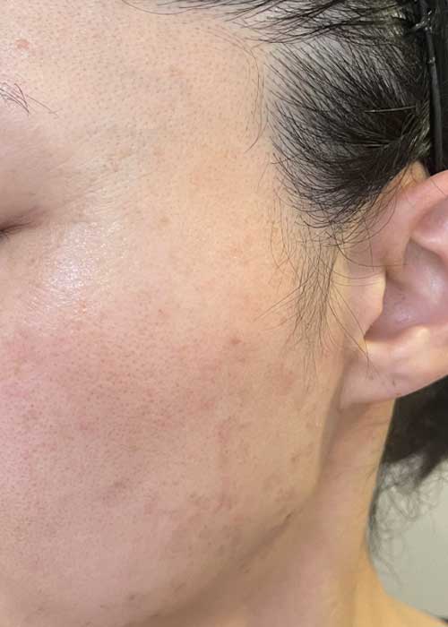 赤みのピークは少し超えた感じです。レーザーに反応した大きなシミが分解されて小さくなくなっていきました。まだ若干のひりつきあり。